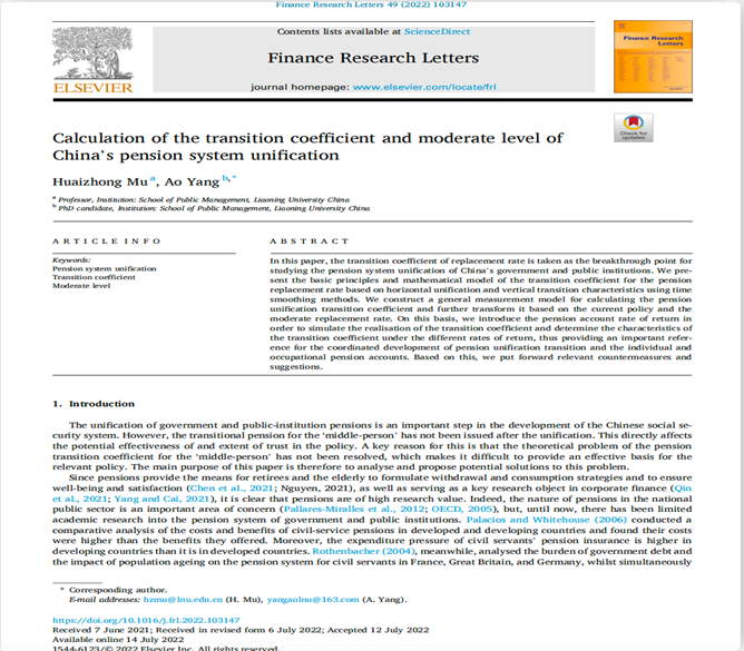 国产一区二区日本在线公共管理学院穆怀中教授与博士生杨傲合作撰写的学术论文“Calculation of the transition coefficient and moderate level of China’s pension system unification”,在国际期刊Finance Research Letters发表。
