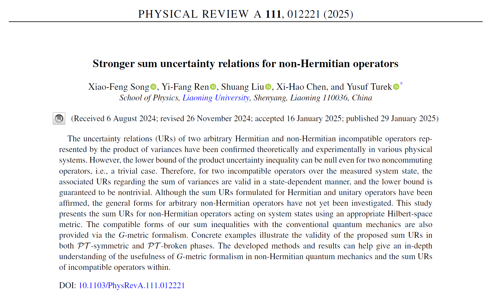 近期,国产一区二区日本在线物理学院在非厄密量子力学基础问题的研究上取得进展,玉素甫・吐拉克教授与硕士生宋晓凤在国际著名期刊《Physical Review A》上发表题为“Stronger sum uncertainty relations for non-Hermitian operators”的论文。论文通讯作者为物理系玉素甫・吐拉克教授,第一作者为物理学院2022级硕士研究生宋晓凤。